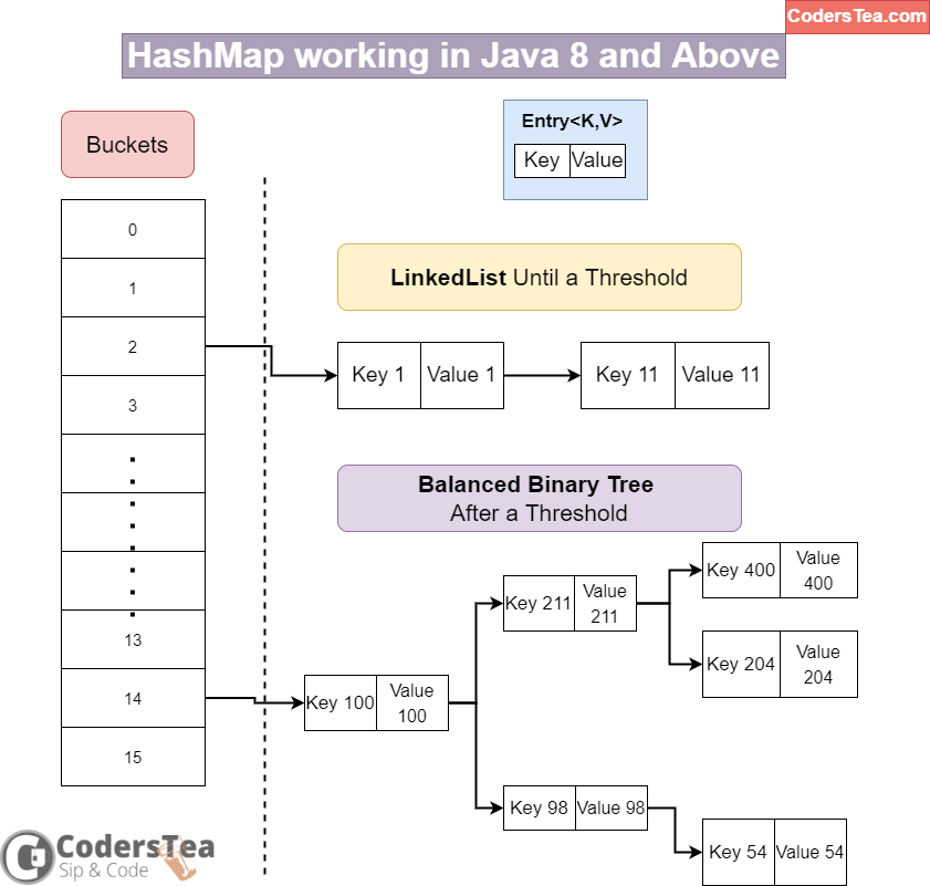 Since Java 8 there is been a slight change in the working of HashMap. Do you know what it is? It’s a Binary Tree. Yes, It uses a Binray Tree instead of a LinkedList. But not right off the bat. When the map size reaches a certain threshold, it replaces the LinkedList with the Binary Tree. And that too a Balanced Binary Tree. This improves the worst time in a collision from O(n) to O(log n).
